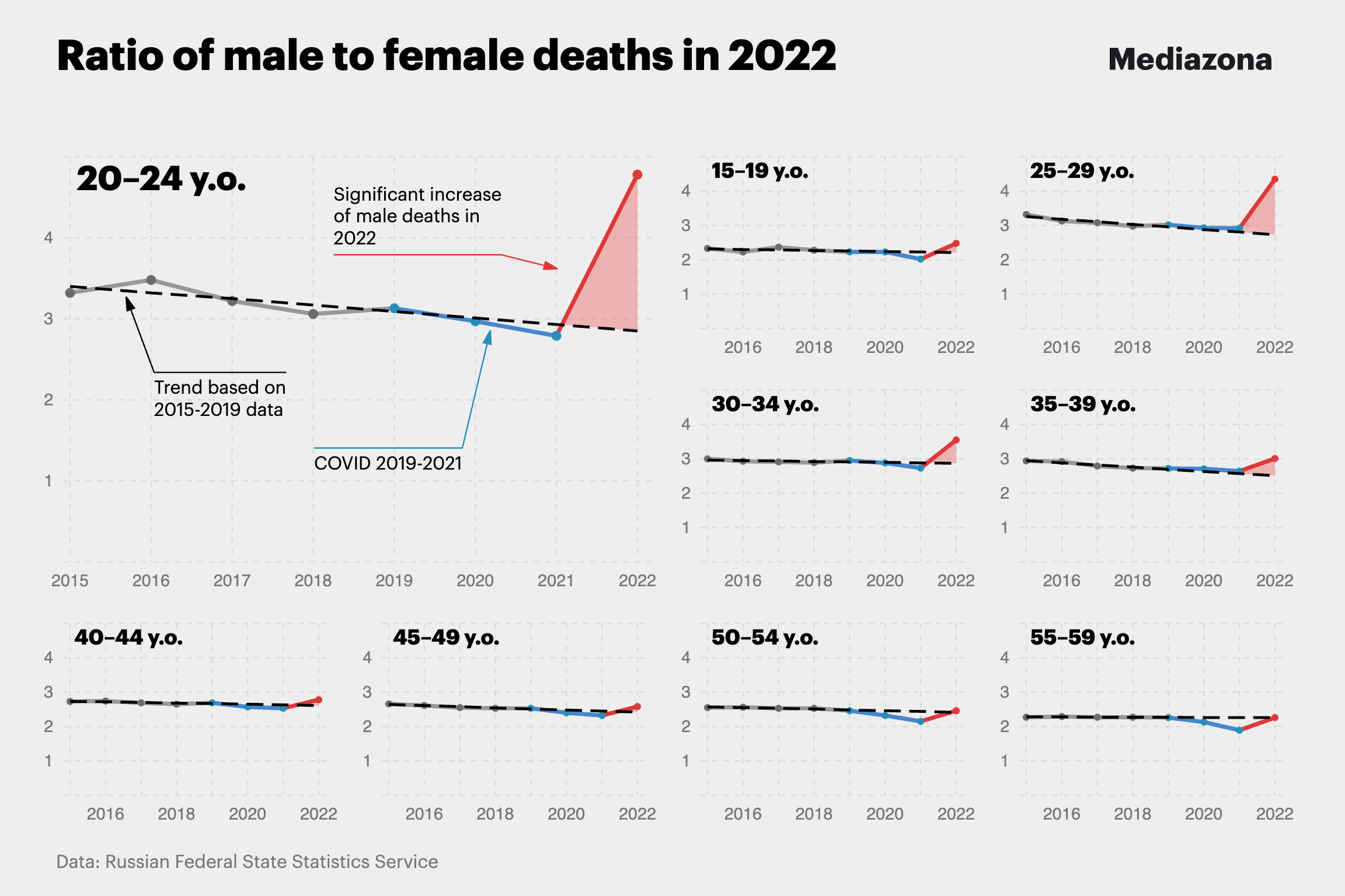 — The validity of our methodology is supported by official mortality data from the Federal State Statistics Service (Rosstat). According to their records, the excess mortality of men under 50 in 2022 was 24,000 (no more recent data is available yet), which is only 4% off from our estimate based on probate cases.