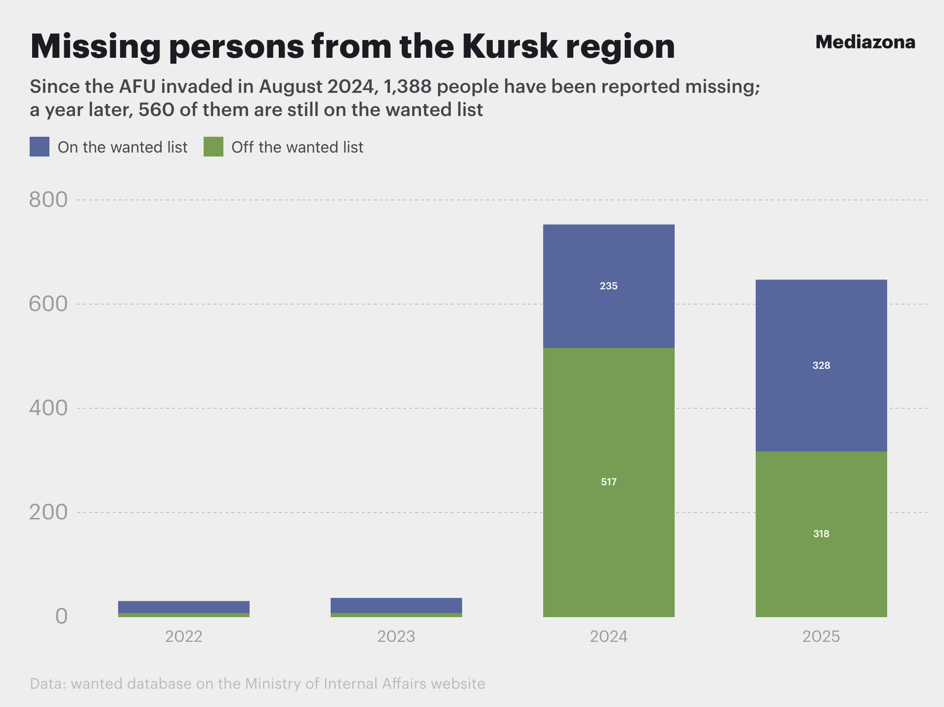 On August 21, the Ministry of Internal Affairs began adding large numbers of missing persons from the Kursk region, mostly from the Sudzha district, to its database. By March 2025, by which time Ukrainian troops had almost completely withdrawn from Russian territory, 1,254 local residents had been added.