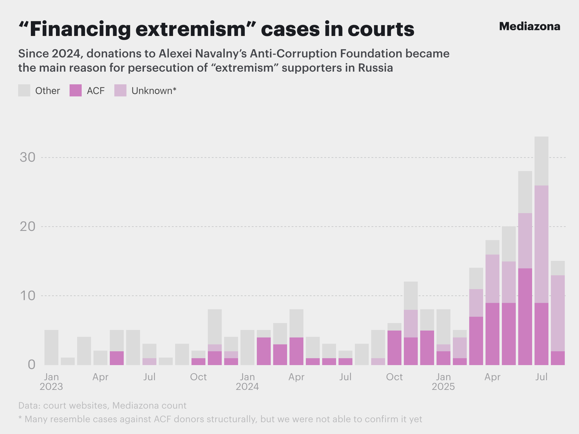 At least 114 criminal cases have been launched in Russia over donations to Alexei Navalny’s Anti-Corruption Foundation (ACF) after it was outlawed as an “extremist” organisation in the summer of 2021, a new Mediazona count has found. The tally is based on court records, press releases from law enforcement agencies, and information provided by the defendants.