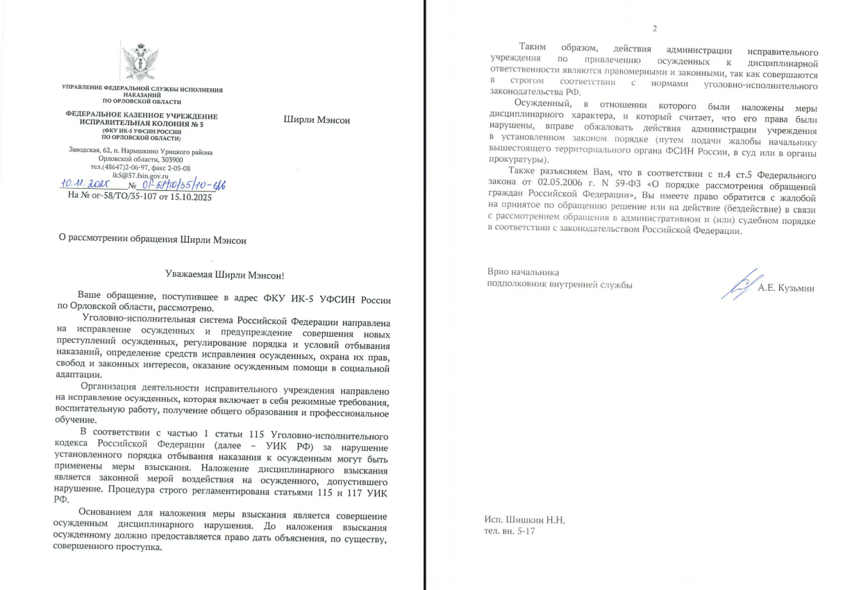 The administration of Penal Colony No. 5 (IK-5) in Russia’s Oryol region has issued a formal, two-page response to a letter from Garbage lead singer Shirley Manson regarding the treatment of imprisoned Russian activist Mikhail Kriger. The letter never mentions Kriger by name—nor does it address the specific allegations of mistreatment that have led the activist to maintain a hunger strike for over a month. Instead, the document offers only a boilerplate description of the penal system’s legal framework and its corrective goals, describing the prison’s actions as “proper and lawful.”