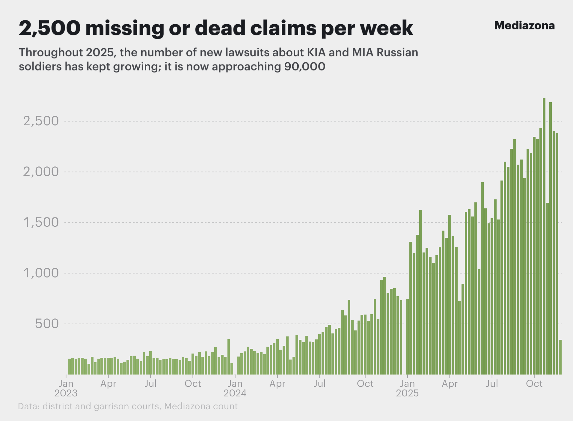 Russian courts have now received almost 90,000 claims to declare missing servicemen dead or missing, a dramatic rise that began only in mid-2024 and continues to accelerate. Courts are processing such cases far faster than we can confirm individual deaths, revealing the scale of losses the state has never publicly acknowledged.
