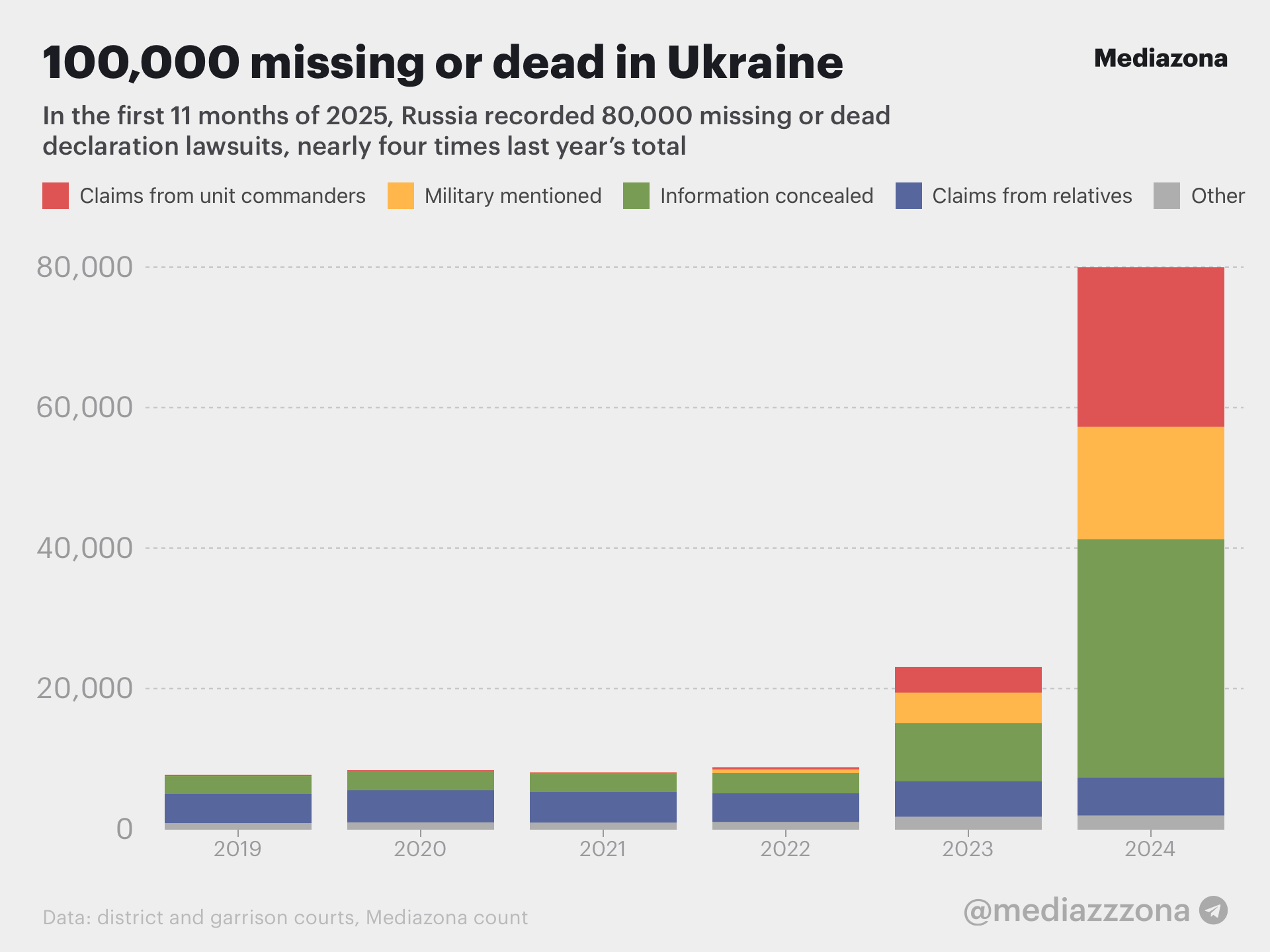 Belousov’s remarks broadly match calculations that Mediazona has begun publishing based on court data on recognising servicemen as missing or dead. In 2025, the number of such claims was more than three times higher than in the previous year, suggesting a concerted effort to secure declarations of death through the judicial system.