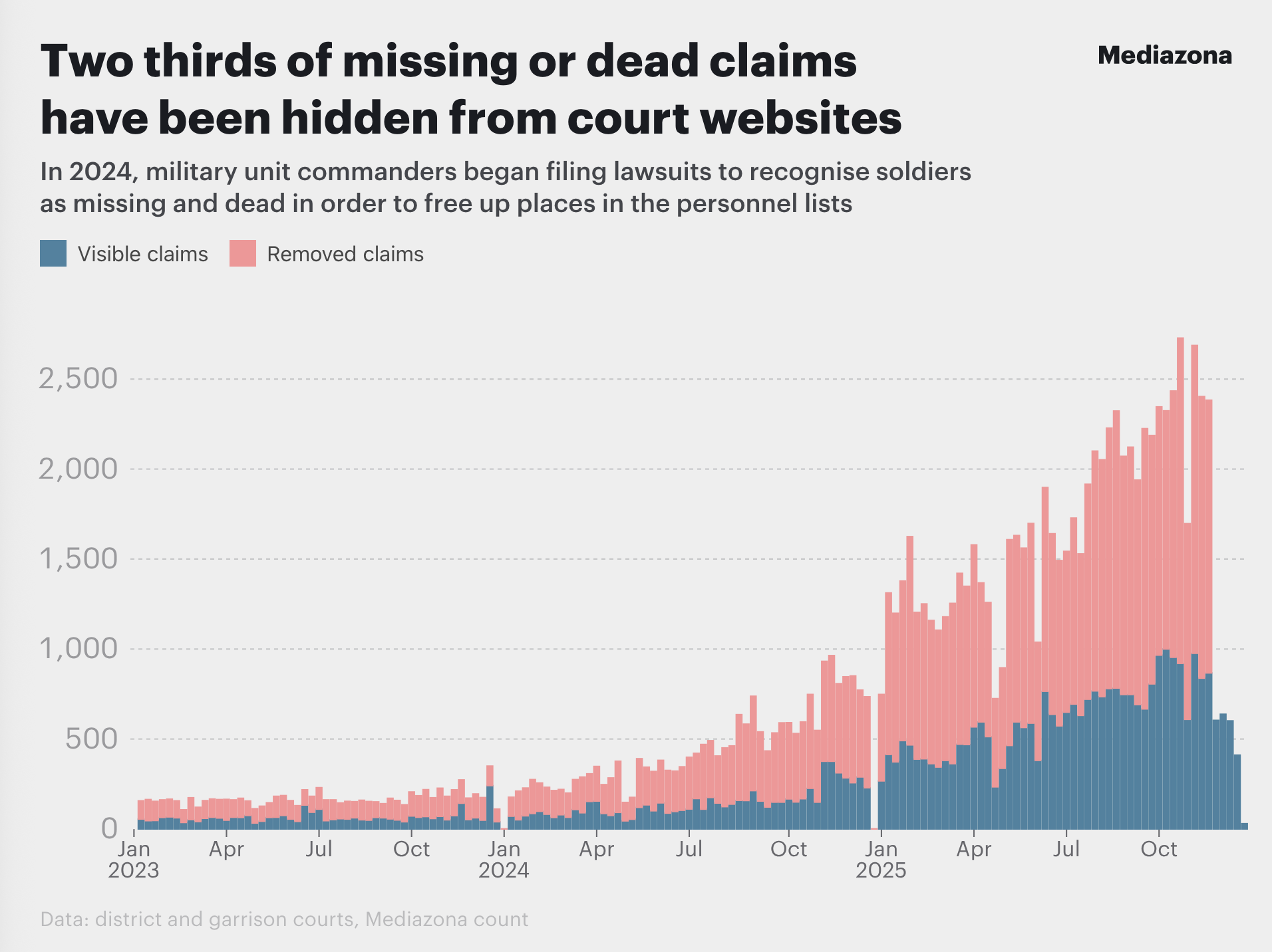 This year saw a massive spike in court-ordered death declarations. Since mid-2024, approximately 90,000 lawsuits have been filed to declare missing soldiers legally dead, a procedure that allows the Ministry of Defence to categorize them as “found” without ever recovering their bodies. The true scale of the unrecovered dead we estimate now exceeds 180,000.