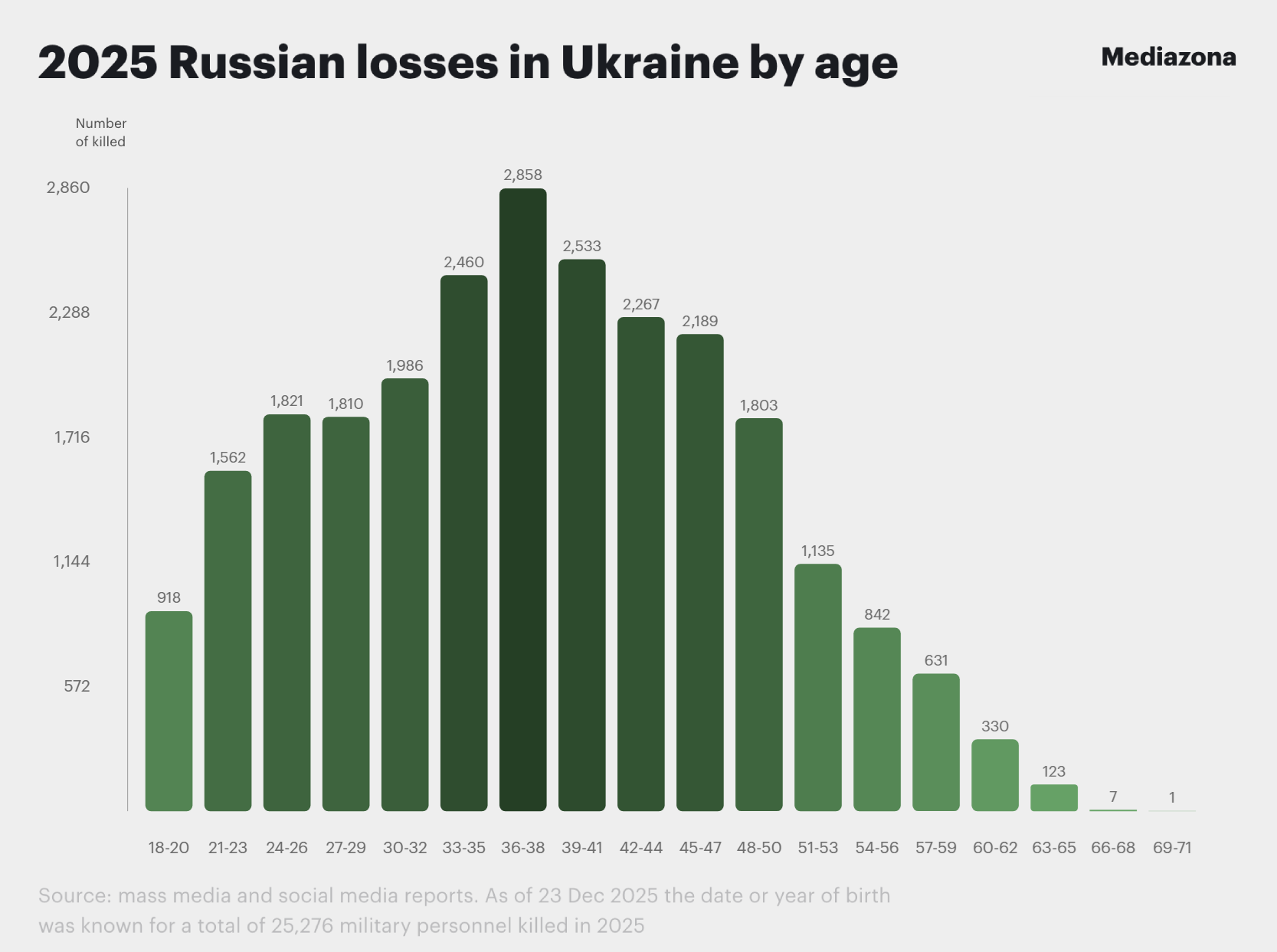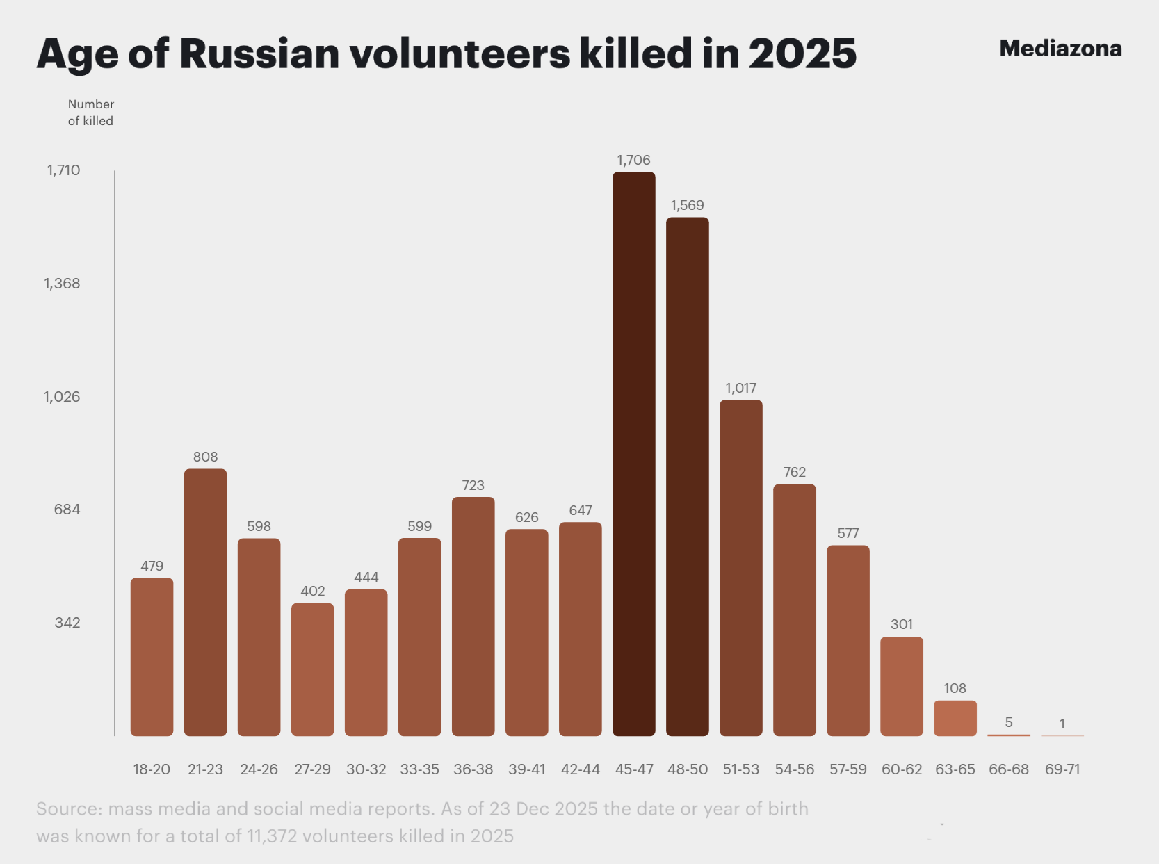 The volunteer fighters represent the largest category of casualties in the Russian army, based on our data. The average age of the volunteers killed in 2025 is trending towards 50. The most frequent age of death recorded this year is between 46 and 52.