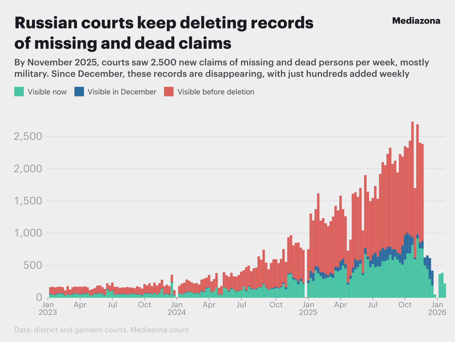 In 2026, Russian courts continued to remove records of claims to declare people missing or dead.