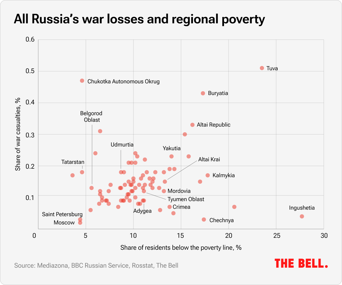 But there is also a “reverse” anomaly in the regions of the North Caucasus. For example, while the poverty rate in Karachay-Cherkessia and Ingushetia is significantly higher than the national average, the level of losses remains very low, roughly on par with the richest cities of Moscow and St. Petersburg. Most likely, the Kremlin avoids setting strict recruitment targets for the heads of these republics to prevent social tension in an already volatile region.