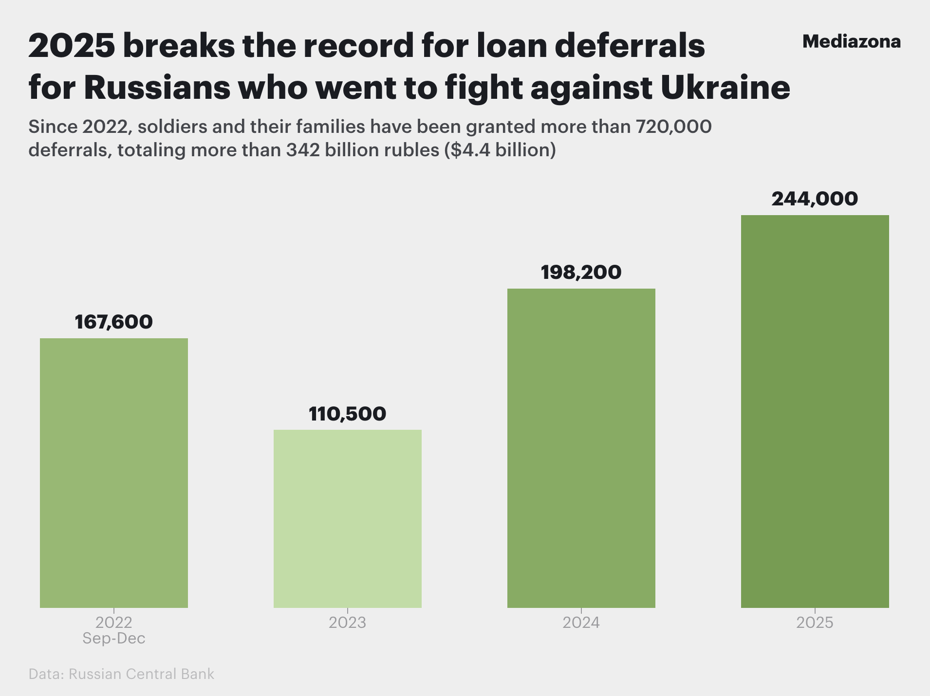 In 2025, Russian banks processed 244,000 loan deferrals (credit holidays) for citizens deployed to the war in Ukraine and their families. These figures from the Central Bank, reviewed by Mediazona, provide unique insight into the ongoing recruitment efforts of the Russian military.