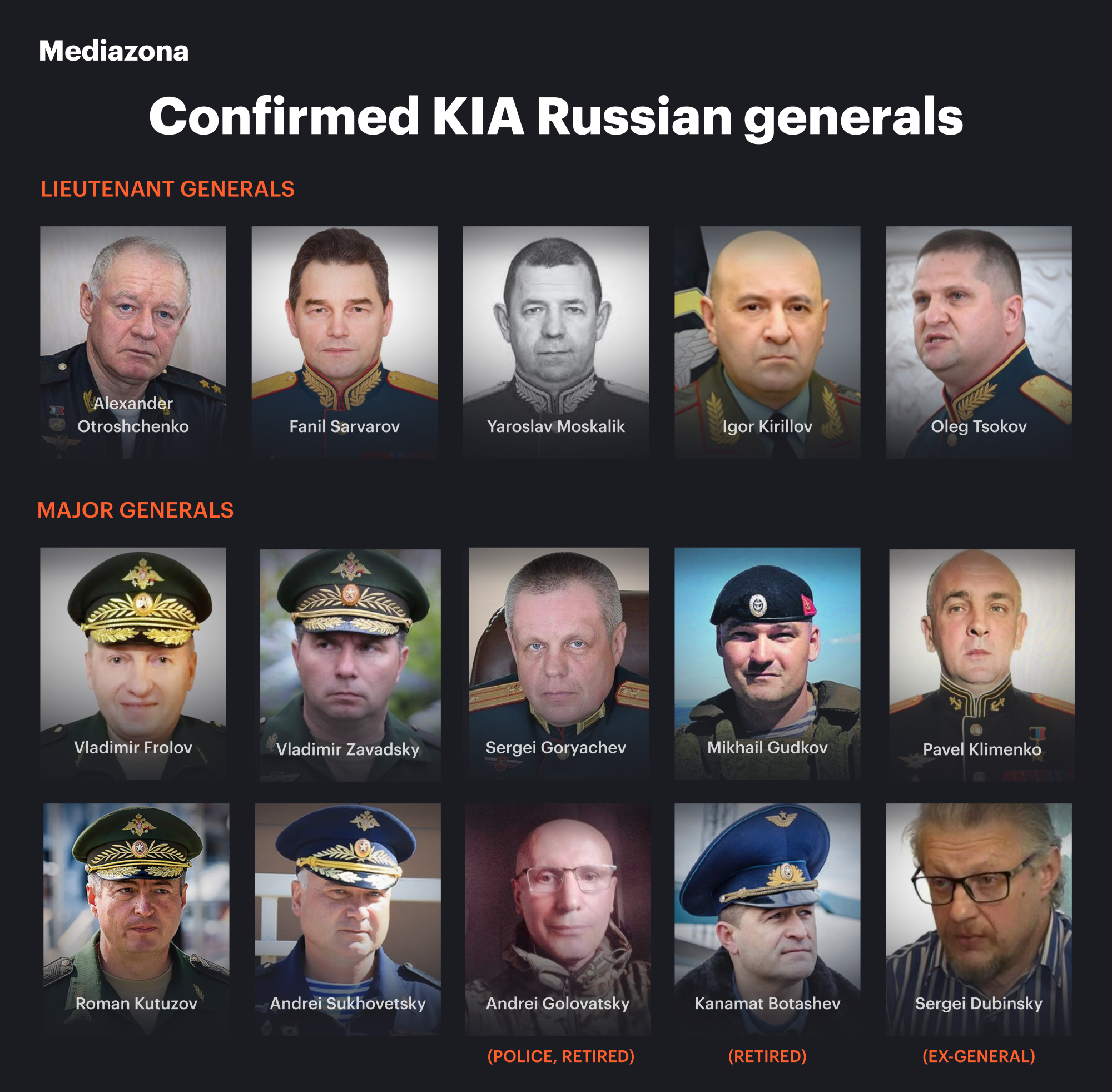 Since Russia launched its full-scale invasion of Ukraine in February 2022, at least 15 of its generals have been confirmed killed—in drone strikes, car bombings, crashes, and on the front line. In March, Lieutenant General Alexander Otroshhenko reportedly died in a plane crash over Crimea. Mediazona has reconstructed the toll and the careers of these generals.