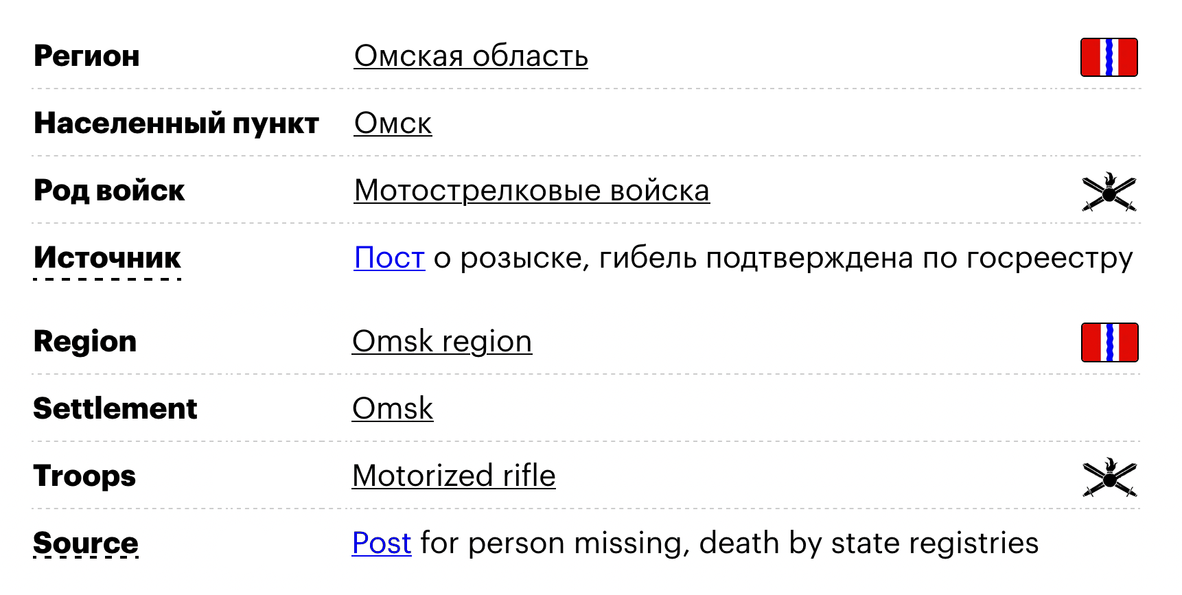 As before, we don’t count missing persons in our reports, they are a separate category that’s virtually impossible to track. We use posts about missing service members as a source of full names and as proof that the individual participated in the war. We then check the registries to see if a person with that full name has already been declared dead, and if so, we add them to our tally.